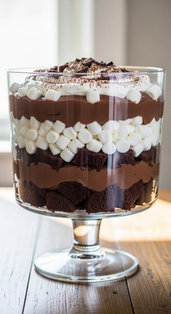 This Hot Chocolate Trifle layers moist chocolate cake, velvety pudding, fluffy whipped cream, and mini marshmallows to create the ultimate winter dessert. It’s beautiful, easy to assemble, and perfect for Christmas parties or cozy nights in.