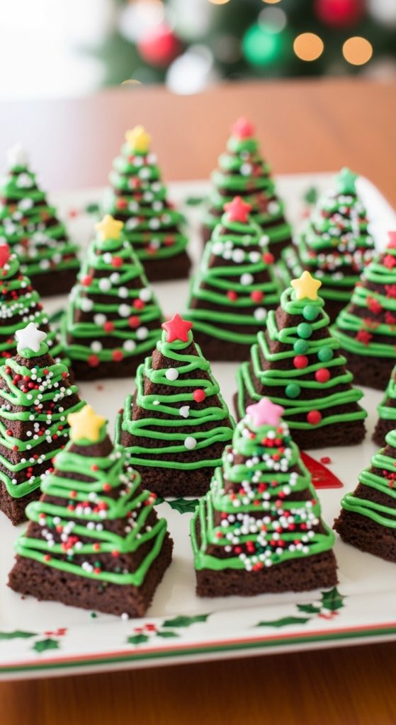 Cut cooled brownies into long triangles to form Christmas tree shapes.