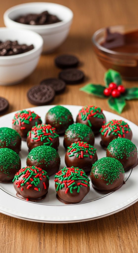 Soft, creamy Oreo centers coated in chocolate and decorated with festive sprinkles. No baking required, minimal ingredients, and perfect for holiday treat platters or gifts.