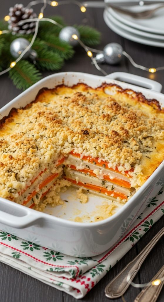 This Creamy Carrot & Parsnip Bake is a cozy, lightly sweet, and beautifully aromatic Christmas casserole that highlights two classic winter vegetables. Tender slices of carrots and parsnips are layered in a silky herb cream sauce, topped with cheese and golden crumbs, and baked until bubbling and irresistible. It’s an elegant, colorful side dish that brings warmth and balance to any holiday meal.