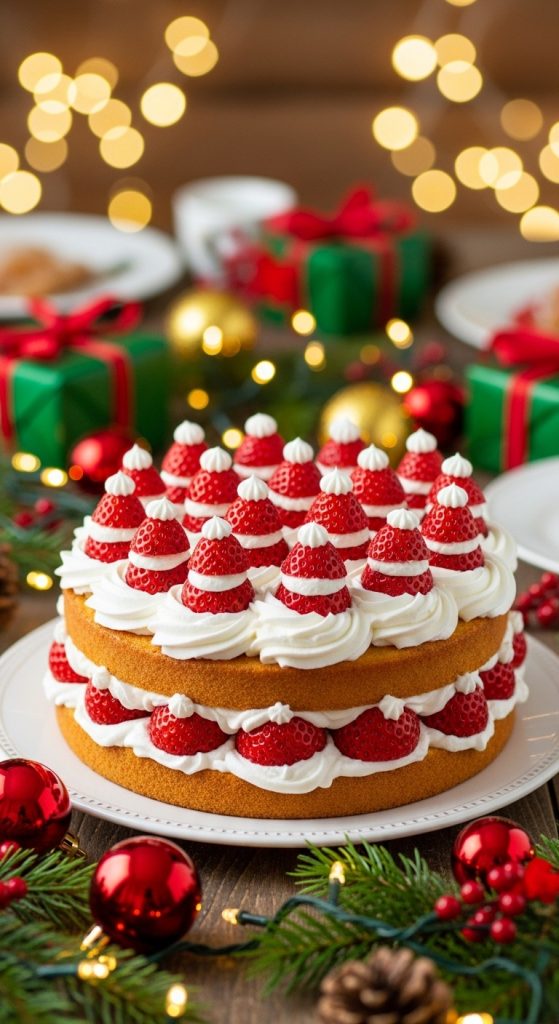 This Santa Hat Strawberry Christmas Cake is festive, light, and wonderfully eye-catching. Fresh strawberries sit atop swirls of whipped frosting, each resembling a tiny Santa hat—making this cake perfect for Christmas parties, family gatherings, and holiday photo moments.