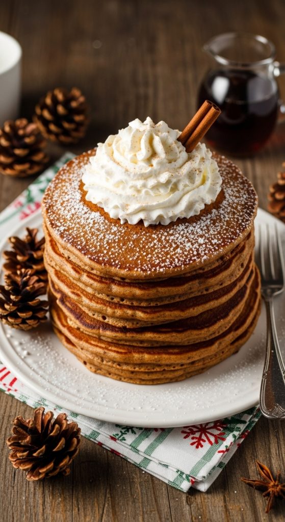 Bring the cozy flavor of gingerbread cookies to your breakfast table with these soft, warmly spiced pancakes. They’re rich with molasses, cinnamon, and ginger—perfect for a festive morning. Top them with maple-sweetened whipped cream and a drizzle of syrup for the ultimate holiday indulgence.
