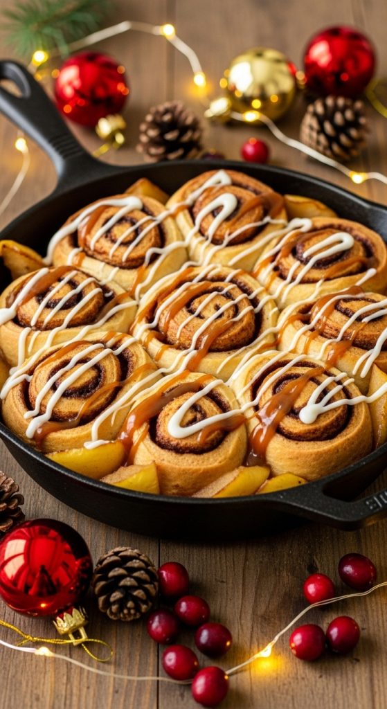 Golden cinnamon rolls baked in a skillet with tender apples and gooey caramel—your new favorite one-pan holiday treat.