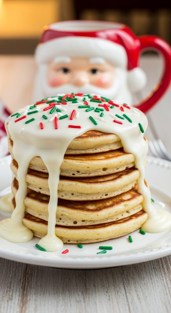Fluffy, buttery pancakes that taste just like classic sugar cookies—drizzled with sweet vanilla icing and holiday sprinkles.
