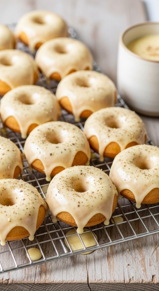 These festive donuts are soft, spiced, and full of holiday cheer—baked instead of fried and finished with a dreamy eggnog glaze. They’re perfect for serving on a platter with coffee, cocoa, or even a splash of extra eggnog.