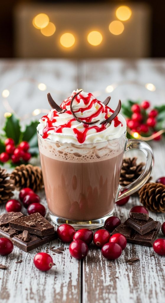 Add whipped cream if desired. Finish with a drizzle of cranberry syrup, chocolate curls, or a single fresh cranberry for a bright festive touch.