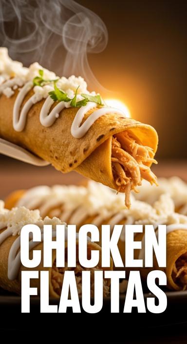 Chicken Flautas are crispy rolled tortillas filled with seasoned shredded chicken and fried until golden and crunchy. This popular Mexican dish is known for its delicious combination of savory filling and crispy texture. Flautas are typically served with fresh toppings such as shredded lettuce, sour cream, salsa, cheese, and guacamole, making them perfect for family dinners, parties, or casual gatherings.